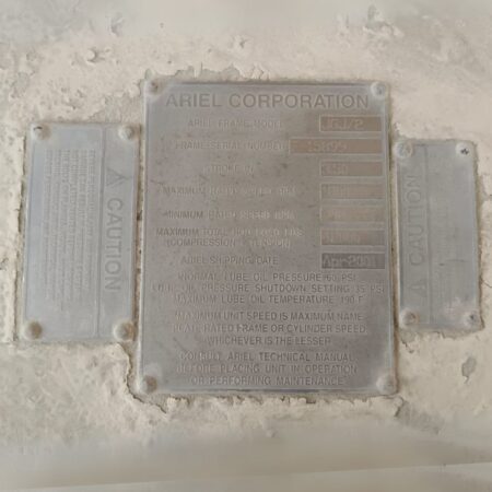 | Additional Details | Ariel Compressor | Frame Serial Number: F-15899 | Compressor Model: Ariel JGJ/2 | Stroke: 3.50 in | Max Rated Speed: 1800 RPM | Min Rated Speed: 350 RPM | Max Total Rod Load: 76000 lbs (Compression + Tension) | Shipping Date: Apr 2001 | Normal Lube Oil Pressure: 60 PSI | Oil Pressure Shutdown Setting: 35 PSI | Max Lube Oil Temperature: 190°F |